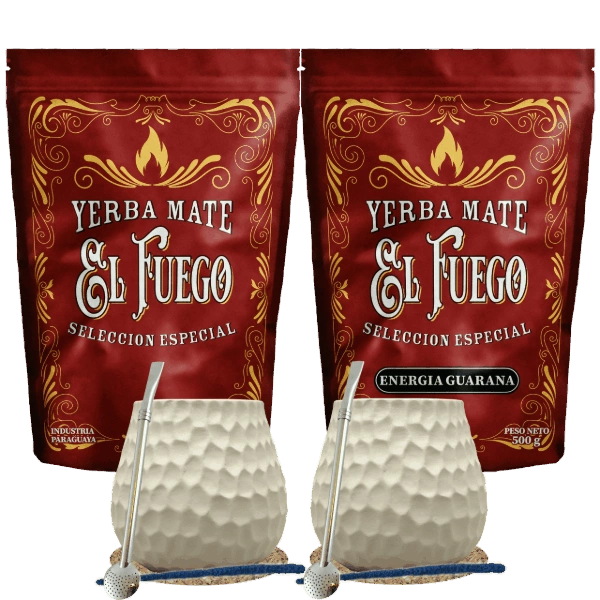Startpaket för två personer Yerba Mate El Fuego 2×500 g + 2× Kalebass + 2× Bombilla