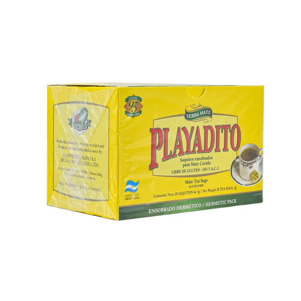 Playadito Saquitos - klassisk yerba mate utan tillsatser, förpackad i tepåsar. Aromatisk och mild, med knappt märkbar bitterhet. Den praktiska förpackningsformen i påsar gör att infusionen kan förberedas snabbt och enkelt - häll bara varmt vatten över mate-teet och vänta några minuter. Producenten av Playadito är det välkända argentinska företaget Cooperativa Agricola de la Colonia Liebig, som har producerat yerba mate i mer än 95 år.