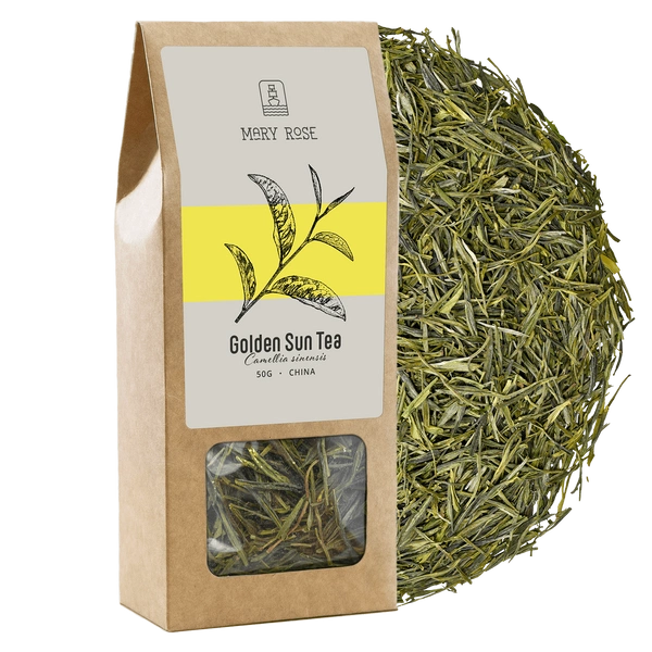 Mary Rose Golden Sun är ett gult te av sorten "Yellow Buds", som härstammar från Anhui-provinsen i Kina. Det är en av de mest sällsynta sorterna bland alla teer. Det kallas också "kejsarens te", vilket hänvisar till vissa kinesiska legender. Det sägs att för flera hundra år sedan, under Qingdynastin i Kina, var gult te reserverat enbart för kejsaren, och den som vågade smaka på det dömdes till döden. Gult te har en mycket behaglig smak och arom. Infusionen har en blekt gulgrön färg. Doften har söta toner och smaken är först lite gräsig för att sedan utvecklas till en eftersmak av mogna päron.