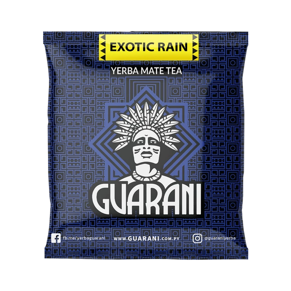 • Guarani Exotic Rain är en energigivande paraguayansk yerba mate med en tropisk smak av mango, papaya, ananas och apelsin. Kraften hos Ilex paraguariensis och fruktig friskhet kommer att transportera dig till ett exotiskt paradis!