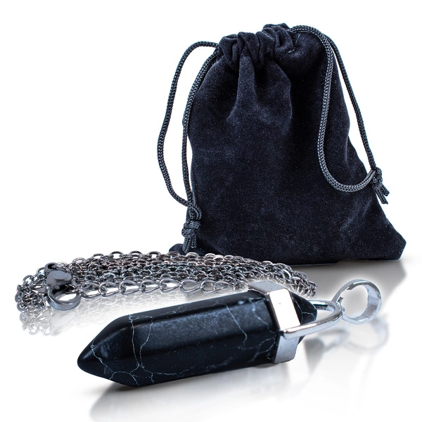 - Svart turkos hänge är en enkel och elegant form av energetiskt skydd. Den syntetiska stenen, djupt svart med ljus ådring, stöder intuition, jordning och andlig balans.