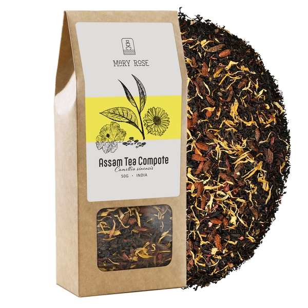 - Mary Rose Assam Compote är en utsökt blandning av svart assamte och en rad värdefulla tillsatser av naturligt ursprung. Bland dessa är hibiskus den mest framträdande, vilket ger helheten en syrlig karaktär som bidrar till uppfriskning.