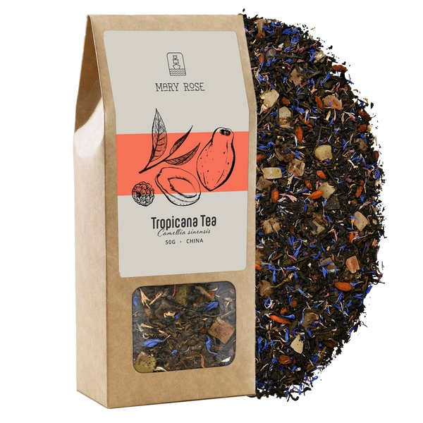Mary Rose Tropicana är en gourmetteblandning som kombinerar pu-erh och smaken av söta tropiska frukter som papaya och mango. Sötman bryts upp av fruktiga tillsatser i form av gojibär och hallon. Mary Rose Tropicana-te glädjer inte bara med sin smak utan också med sitt utseende - blå och röda blåklintblad skimrar vackert i det torkade teet.